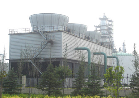 3、GFN无填料喷雾冷却塔是通过雾化装置将水喷成雾状,使空气和水的微小粒状均匀接触,而填料塔是通过布水喷头将水分布在填料上以膜状与冷风接触。